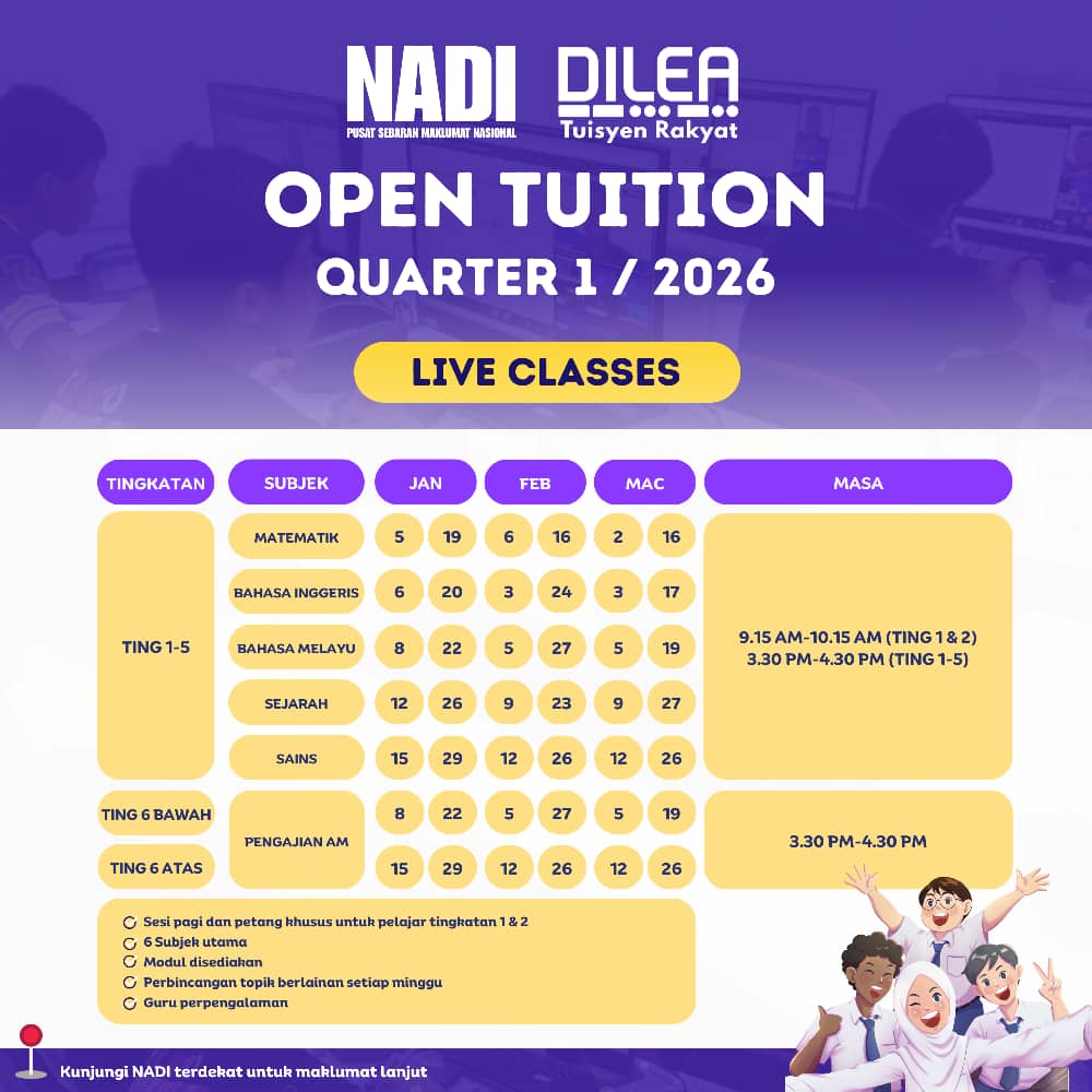 📢 INFO TERKINI PROGRAM DILEA TUISYEN RAKYAT QUARTER 1/2026 📢 Assalamualaikum & Salam Sejahtera semua 🌸 ✨ GUIDANCE TUITION📌 Tingkatan 5 → Jumaat, Sabtu & Ahad (ikut zon)📌 Tingkatan 4 → Ahad – Jumaat (ikut zon) ✨ OPEN TUITION➡️ Sesi […]